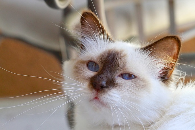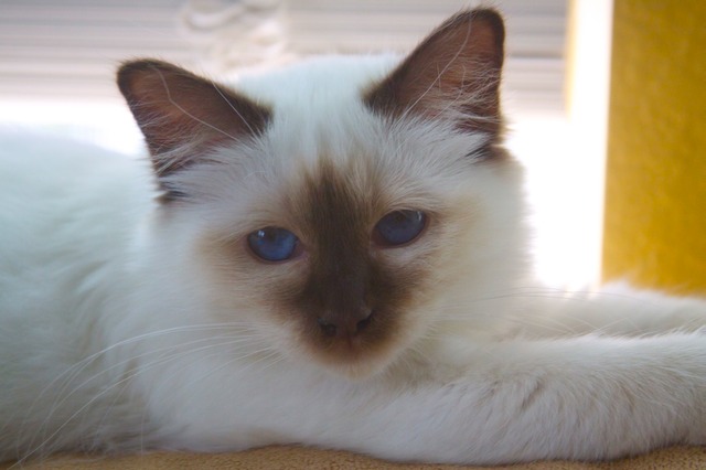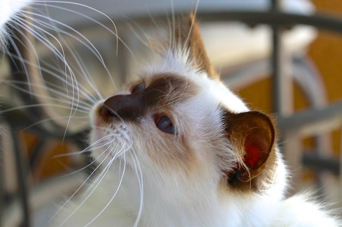 Morphology: Cookie has beautiful blue eyes, a nice warm chocolate point milk color, a soft silky middle coat (as all Birman should have - it’s being lost in many lines that used too much Persan to create the new colors - a roman nose, a strong chin, a long tail. She is more the elongated style than the compact one (Fly is the compact style) and reminds more of the siamese size than the Persan.